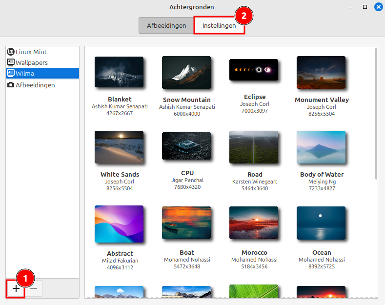 +-knop om je eigen map met foto's te kiezen (zie 1 op afbeelding hieronder).Pas eventueel de weergave-instellingen aan (bijv. vullen, centreren, tegelen - zie 2 op afbeelding hieronder).