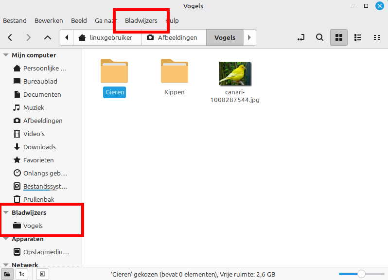 - De map kan nu onder Bladwijzers terug gevonden worden in de linker balk.
