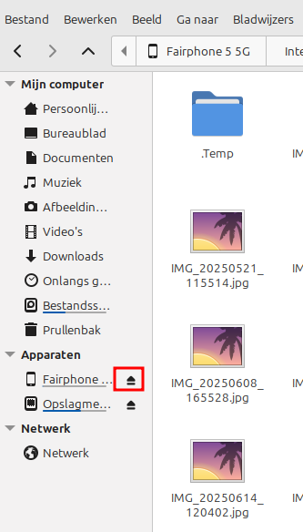 Open de bestandsbeheerder van jouw computer (voor meer info over de bestandsbeheerder, zie ook vorige oefening). In de linkerzijbalk zie je je gsm als nieuw apparaat.