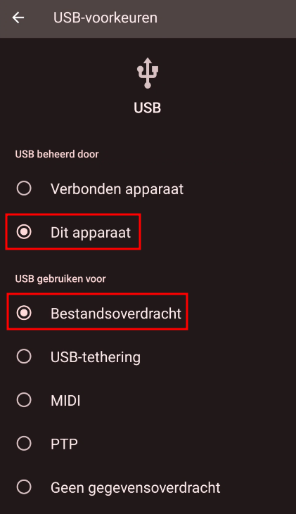 Tip: Als je de opties in USB voorkeuren niet kan veranderen, probeer jouw smartphone dan eens aan te sluiten via een andere kabel.